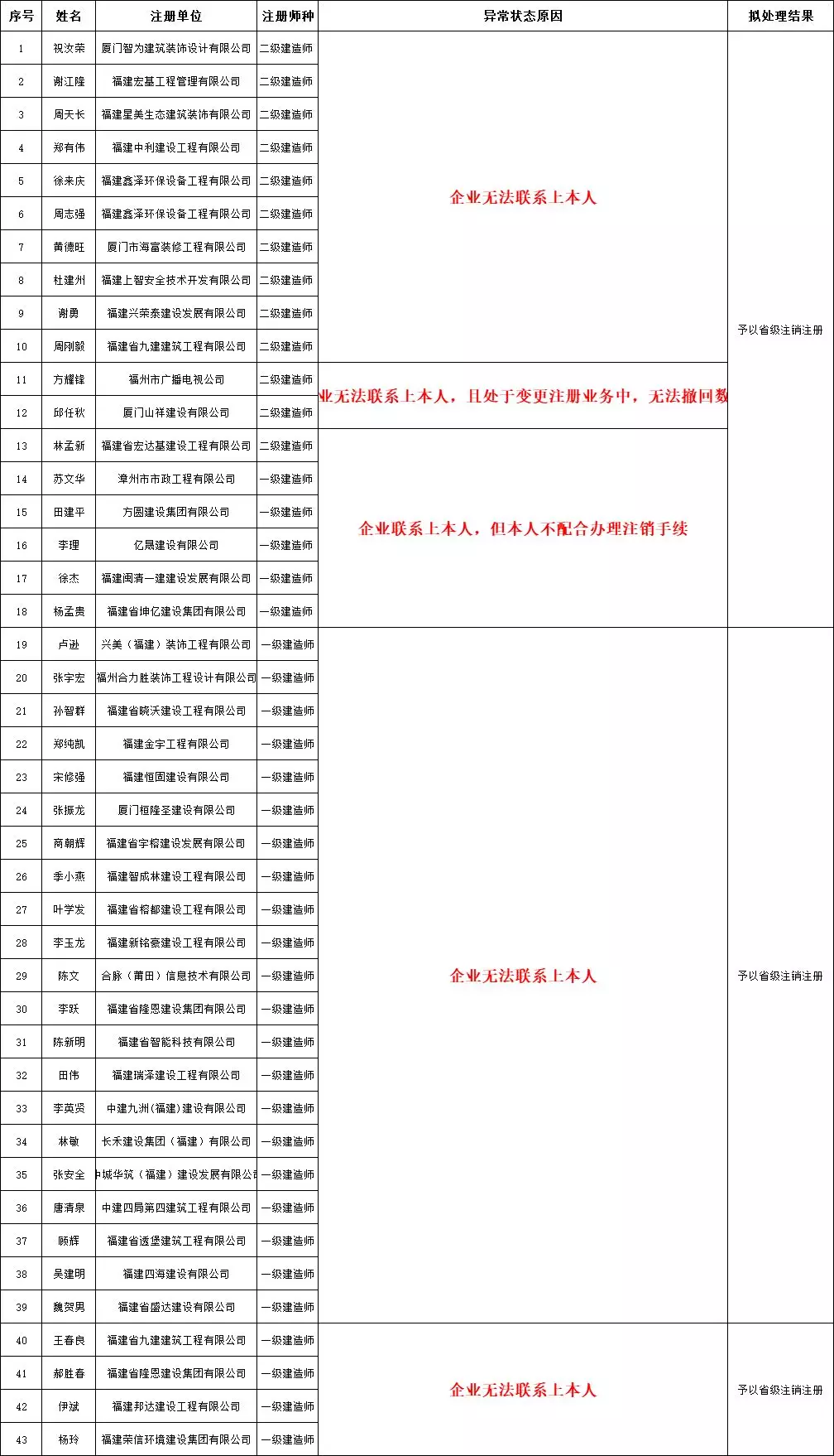 因个人失联或个人不配合等原因导致企业无法正常办理林孟新等43人注销注册的,经研究决定,拟对上述43人的建造师注册证书予以省级注销。