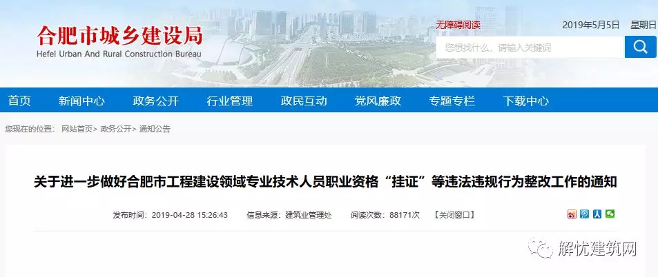 为彻底整治合肥市较多企业注册人员涉嫌违法违规“挂证”问题,2019年4月28日合肥市城乡建设局发布了《关于开展合肥市工程建设领域专业技术人员职业资格“挂证”等违法违规行为专项整治工作的通知》。通知要求各企业领取“涉嫌挂证人员名单”并于5月17日之前整改完毕。